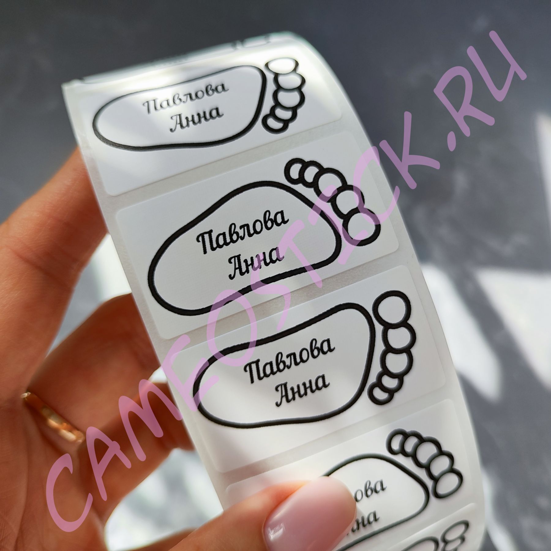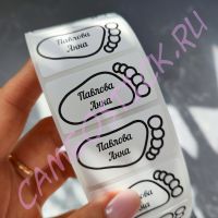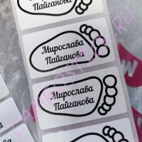 Белые стикеры размером 47*25 мм с устойчивой печатью черного цвета.